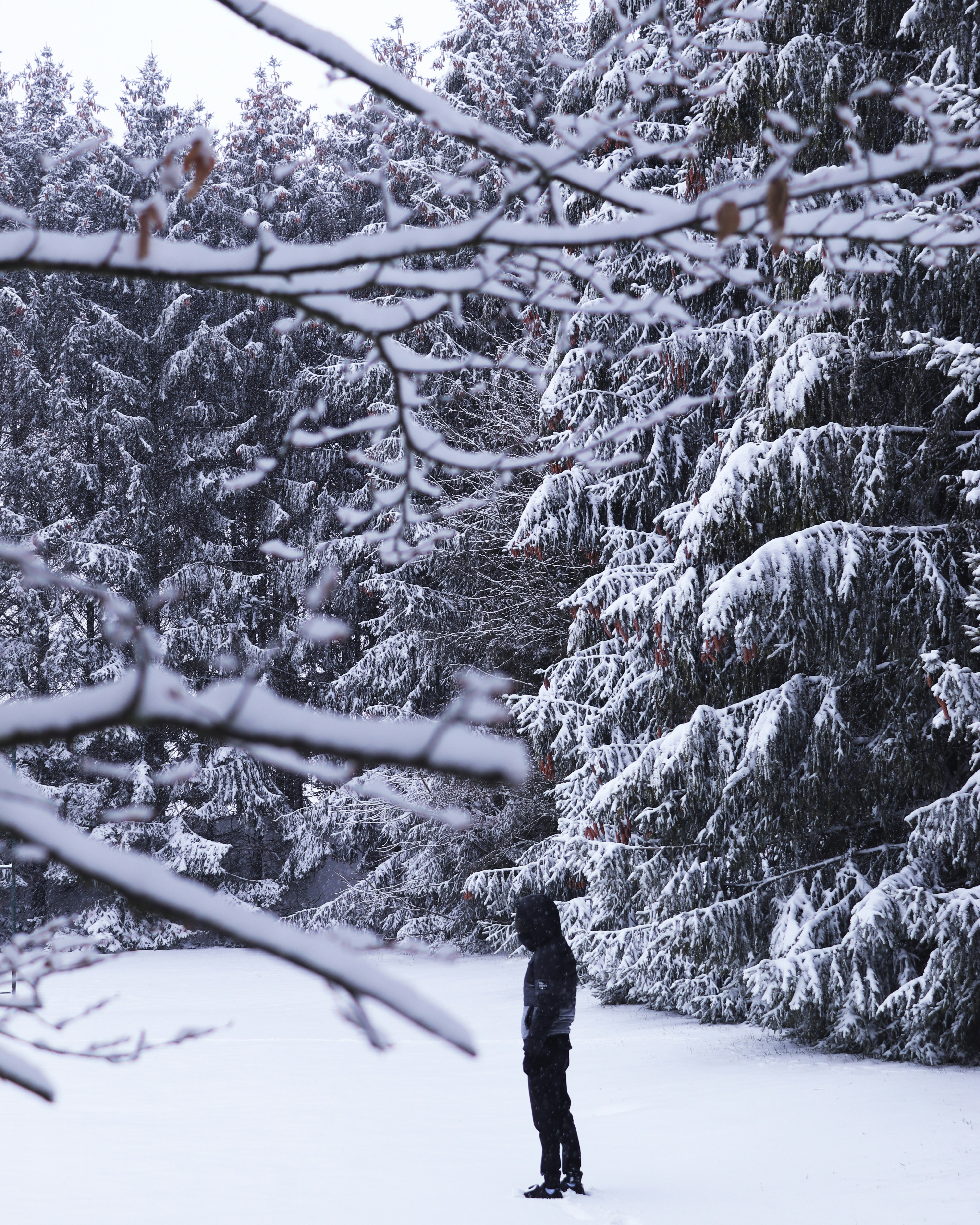 Person Wearing Black Jacket Standing Beside Trees Covered By Snow Photo Free Snow Image On Unsplash