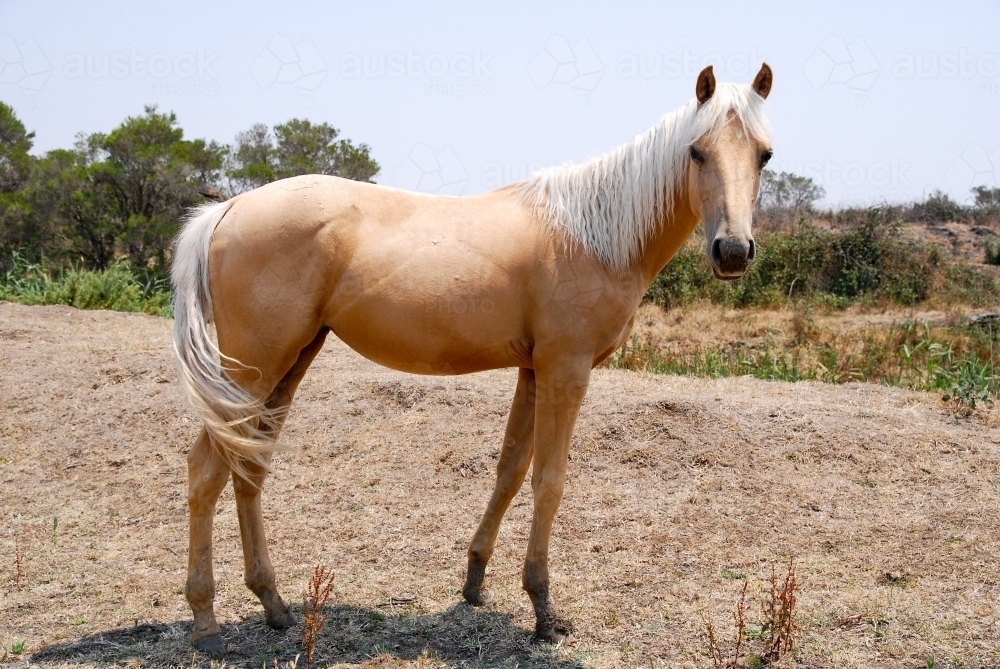 Image Of A Palomino Horse With White Mane And Tail On Dry Farm Land Austockphoto