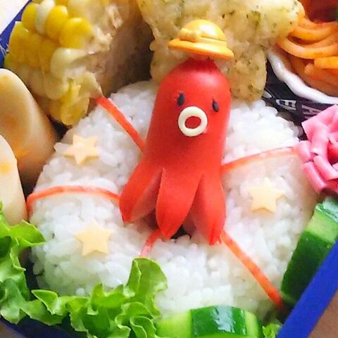 キャラ弁 ダイソー焼きドーナツ型で 浮き輪に乗ったタコちゃんのプール開き弁当 暮らしニスタ