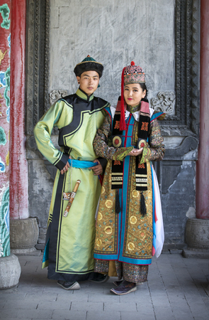 ウランバートルの古い寺院の近くの伝統的な衣装でモンゴルのカップル の写真素材 画像素材 Image